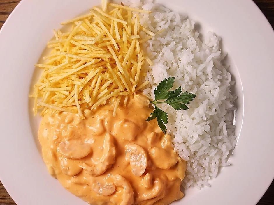 470g de frango em cubos ao molho cremoso com champignon, temperado com aquele toque especial da casa. Acompanha arroz branco soltinho (350g) e batata palha crocante (30g). Uma explosão de sabor e cremosidade em cada garfada.