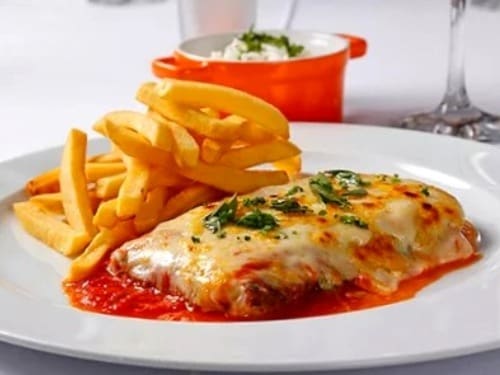 Filet de Frango gratinado no forno com Molho de Tomate fresco e Mozzarella. Acompanha Arroz, Porção de Fritas e Feijão.
